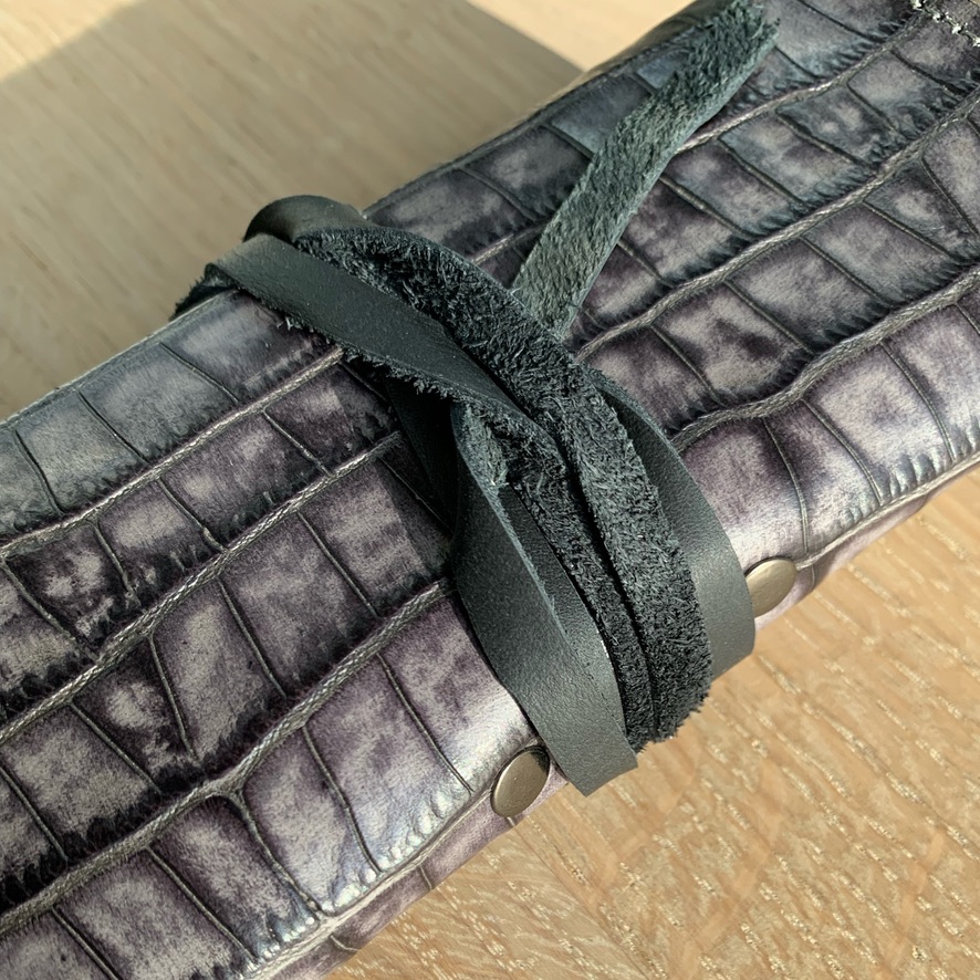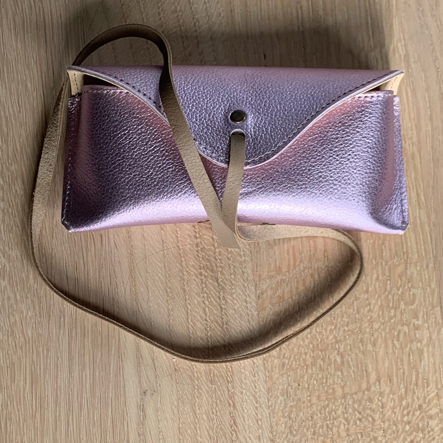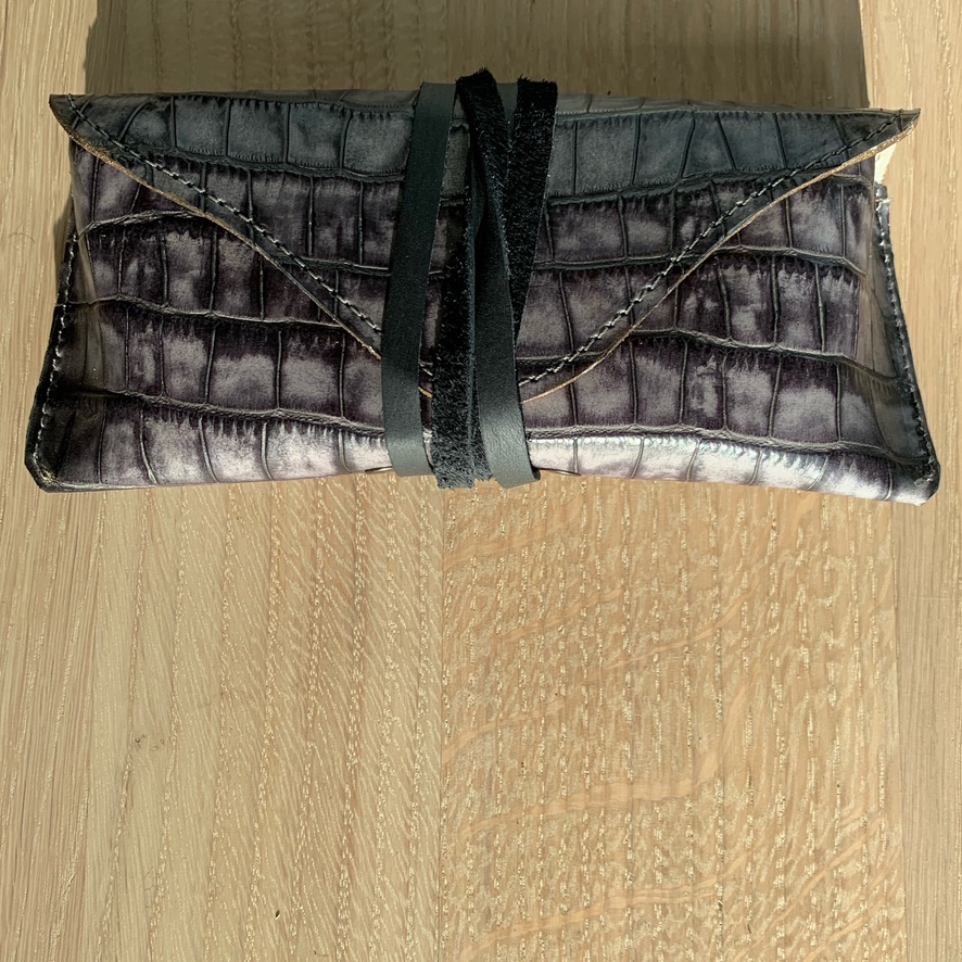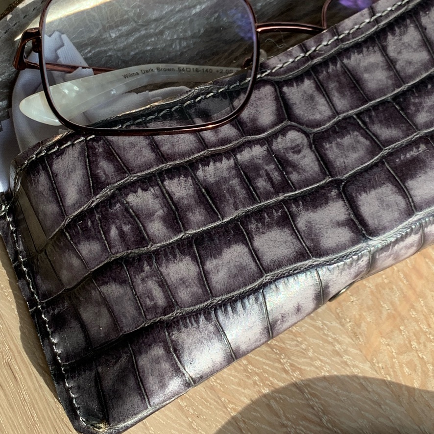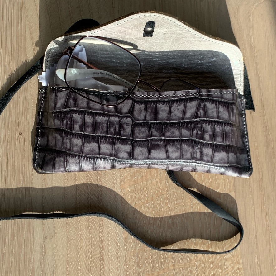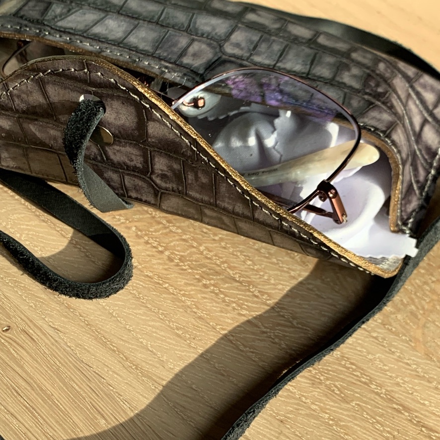 Brillenhoesje, in grijs/bruin croco leer, met een vleugje paars. De binnenkant is heel licht grijs leer.