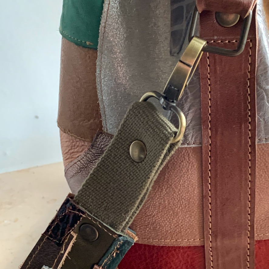Gemaakt van allerlei stukjes leer, in allerlei kleuren zodat hij overal bij past!